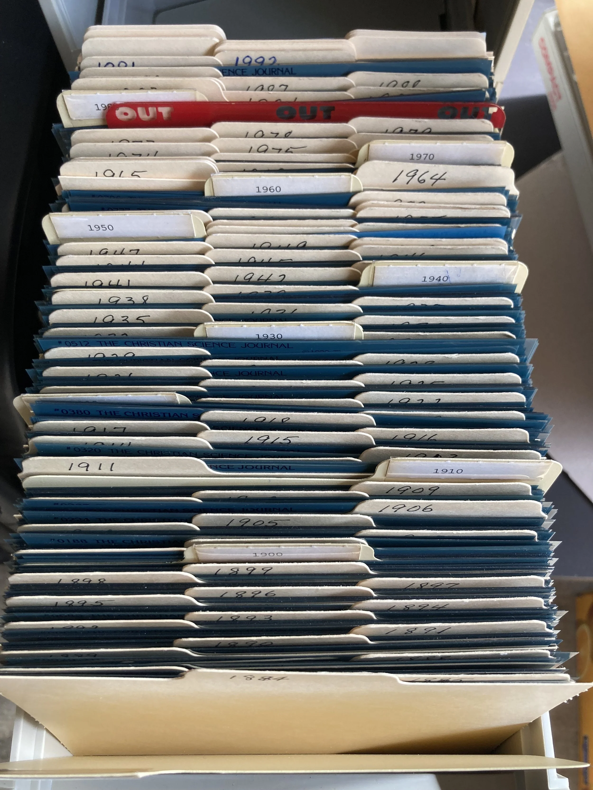 Both the CSJ and CSS microfiche and the CSM microfilm went to the archival collection at Daystar Foundation and Library in Oklahoma City, OK, a relatively new Christian Science history archive and research facility which has been recently expanding its Christian Science materials collections since expanding its archival storage space. Check it out next time you are in OK City.