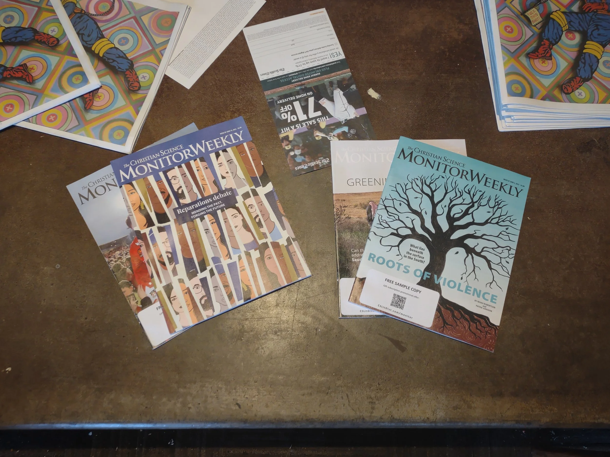 Here’s a table in a public area that had another publication on it already, before we put several issues of the Monitor on it.